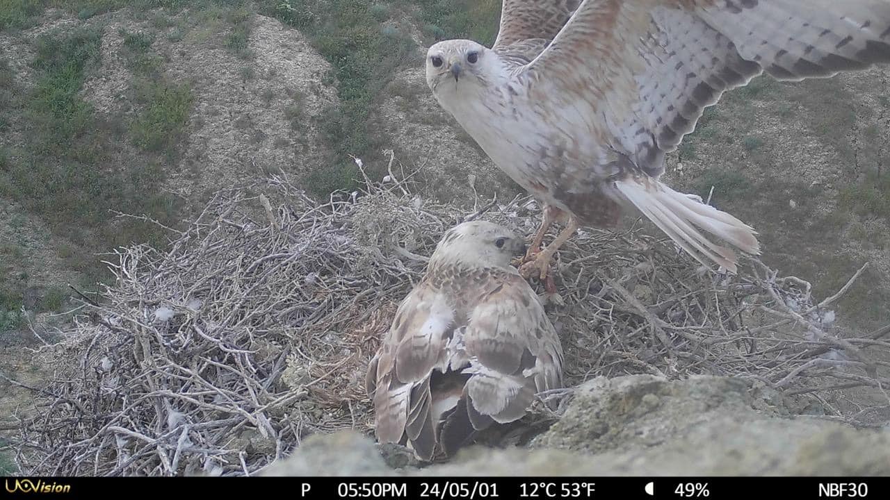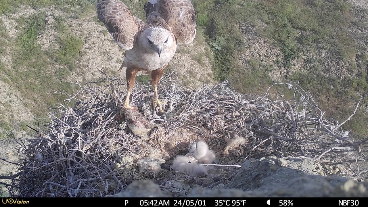 Курганник - хищная птица, принадлежащая к семейству ястребиных. Вес – 1-1,5 килограмма, размах крыльев достигает 405-475 миллиметров. Откладывает 2-5 яиц. Поскольку птенцы начинают летать через 40-50 дней, фотоловушка постоянно наблюдает за ними, пока птенцы не расправят крылья, - сообщили в управлении.