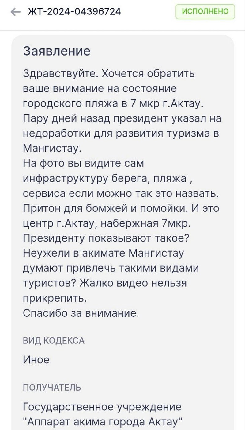На недавнем выступлении глава государства указал на недоработки для развития туризма в Мангистау. Ему показывают картину пляжу? Неужели в акимате Мангистау думают привлечь такими видами туристов?, - спрашивает горожанин.