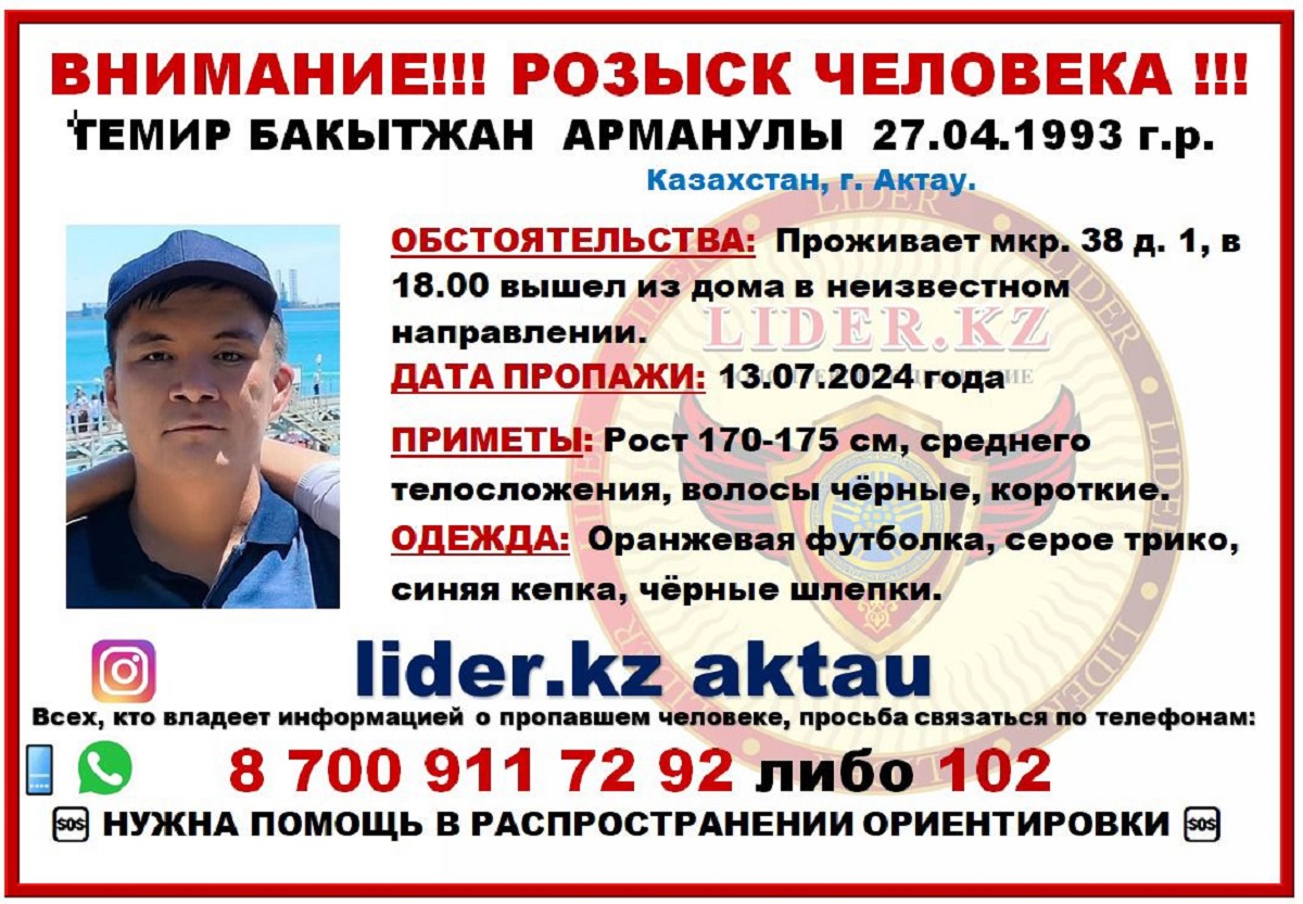 Также волонтеры сообщили, что 13 июля в Актау пропал 31-летний Бакытжан Темир. Мужчина вышел из дома №1 в 38 микрорайоне и не вернулся домой.