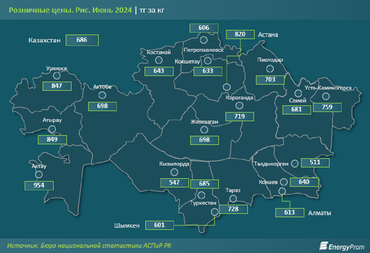 Розничная цена килограмма риса в среднем по стране в июне текущего года составила 686 тг. Дороже всего он стоил на западе страны - в Актау (954 тг за кг), Атырау (849 тг) и Уральске (847 тг), сообщает EnergyProm.kz.