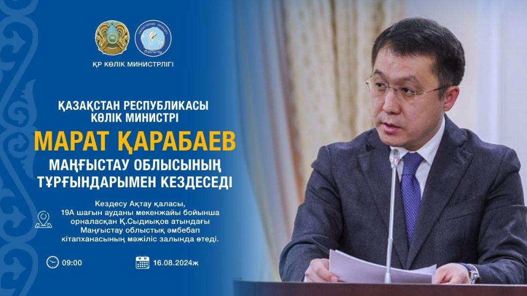 Завтра, 16 августа, Министр транспорта РК Карабаев Марат Каримжанович проведёт встречу с жителями Мангистауской области.