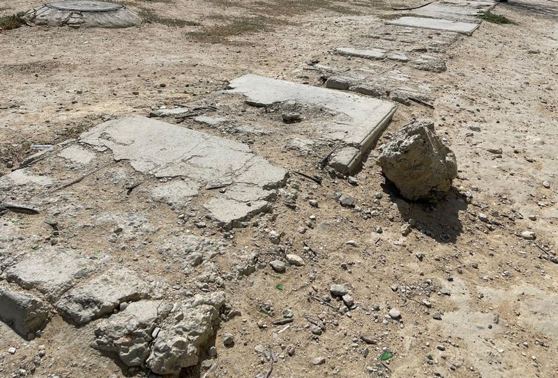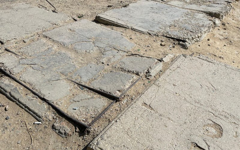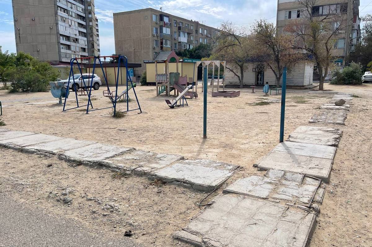 Из советской пешеходной плитки, которая уложена по периметру игровой зоны, в разные стороны торчат арматурные штыри. Жители заявляют, что они представляют смертельную опасность. Ограждений на площадке тоже нет.
