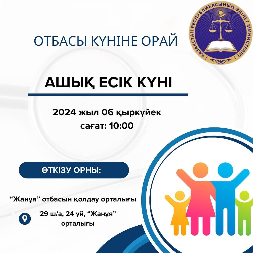 Акция пройдет в центре поддержки семьи «Жануя». В мероприятии примут участие частные нотариусы, адвокаты, юридические консультанты, частные судебные исполнители.