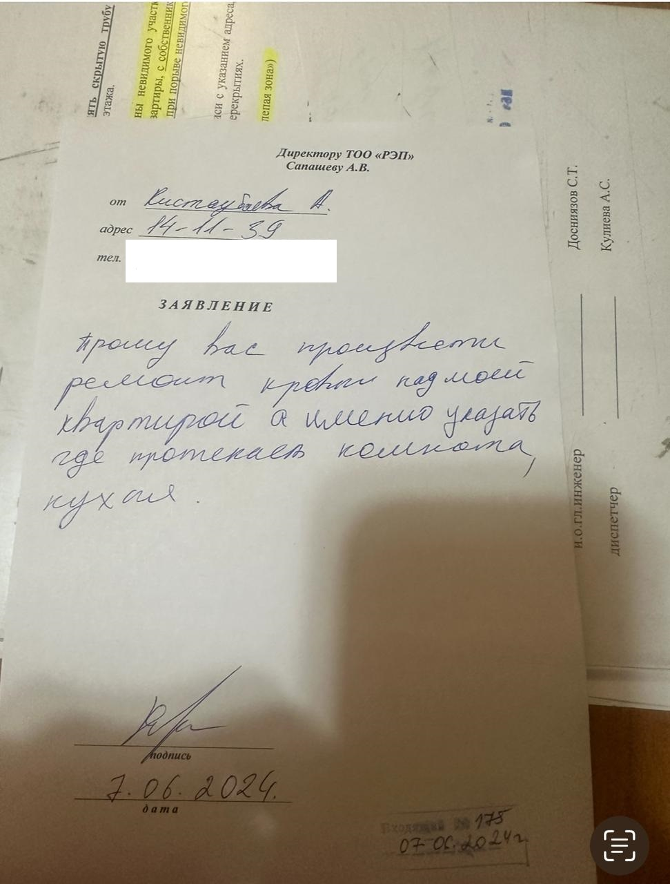 Еще в марте руководитель обслуживающей компании ТОО «РЭП» пообещал отремонтировать крышу в августе, однако на дворе уже сентябрь, а работы так и не начались. Протекающая крыша наносит ущерб нашему имуществу и вызывает постоянный дискомфорт у проживающих на верхних этажах. Мы обеспокоены тем, что если ситуация не изменится, затопления могут привести к ещё более серьёзным последствиям. При этом мы исправно оплачиваем услуги обслуживающей компании каждый месяц, но проблемы с крышей остаются нерешёнными, - рассказала жительница дома Светлана.
