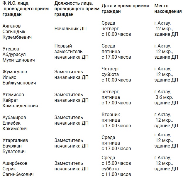 Опубликован график приема граждан руководством департамента полиции Мангистауской области на второе полугодие 2024 года.