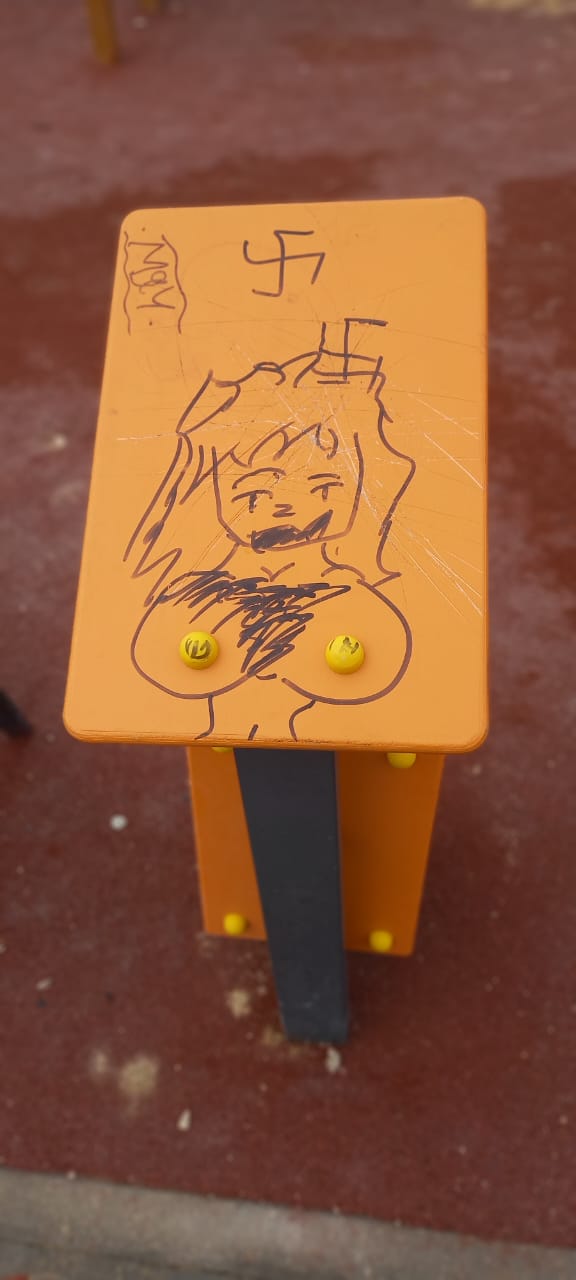 Жители 6 микрорайона возмущены поведением неизвестных, испортивших новую детскую площадку между 21 и 22 домами. Игровой зоне нет еще и месяца, а все качели-карусели осквернены недетскими рисунками, сообщает lada.kz.