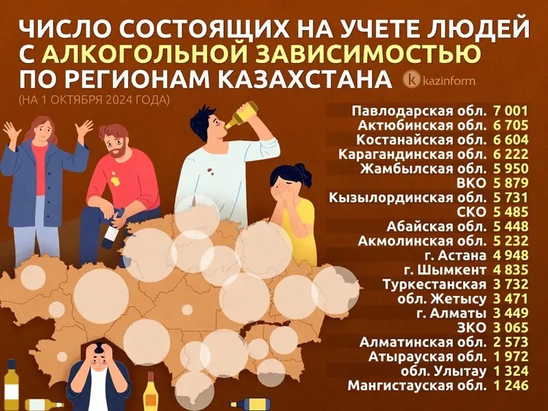 Среди городов республиканского значения - в Астане на учете с алкогольной зависимостью состоят больше всего человек — 4948. В Шымкенте — 4835, а меньше всего в Алматы — 3449.