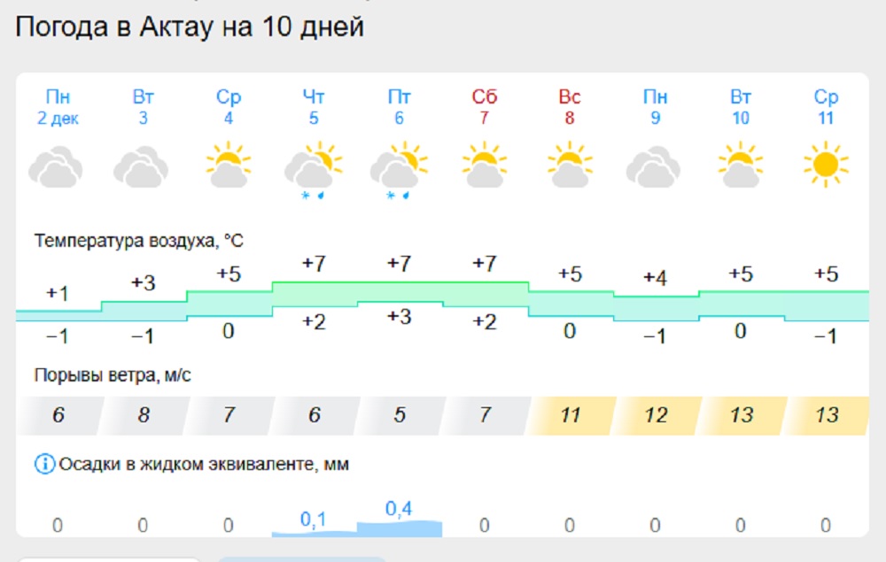 По данным синоптиков Gismeteo.kz, в Актау со 2 по 4 декабря температура воздуха составит -1°С утром, днем воздух прогреется до +3 и ночью +2°С. С 4 по 8 декабря температура воздуха повысится до +2..+7. В четверг и пятницу в областном центре ожидается небольшой дождь со снегом.
