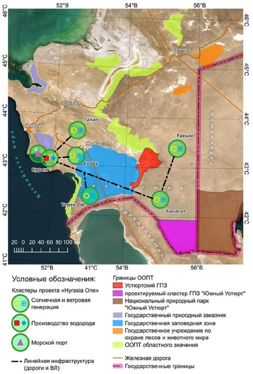 Организовать общественные слушания с участием жителей региона, экологов и местных организаций. Обеспечить публикацию полной информации о проекте, включая экологические и социальные риски. Разработать и представить план мер по минимизации воздействия на биоразнообразие. Будущее региона зависит от правильного баланса между развитием «зеленой» энергетики и сохранением уникальной природы Мангистау. Призываю все стороны начать диалог уже сейчас, чтобы сделать этот проект примером устойчивого развития. Ваше мнение важно, и только совместными усилиями мы сможем защитить богатство природы региона для будущих поколений. Проект «Hyrasia One» обещает огромные инвестиции и перспективное развитие региона. Но вместе с этим он несёт и серьёзные экологические риски, которые могут нанести непоправимый ущерб нашей уникальной природе. Мангистау — это не только земля, где мы живём, но и дом для редких животных, таких как джейраны, куланы и переднеазиатские леопарды. Это место, где каждое растение и каждая птица имеют свою роль в хрупком балансе экосистемы. Мы не можем позволить, чтобы наша природа пострадала из-за отсутствия диалога и учёта мнений общественности, - заключил Кирилл Осин.