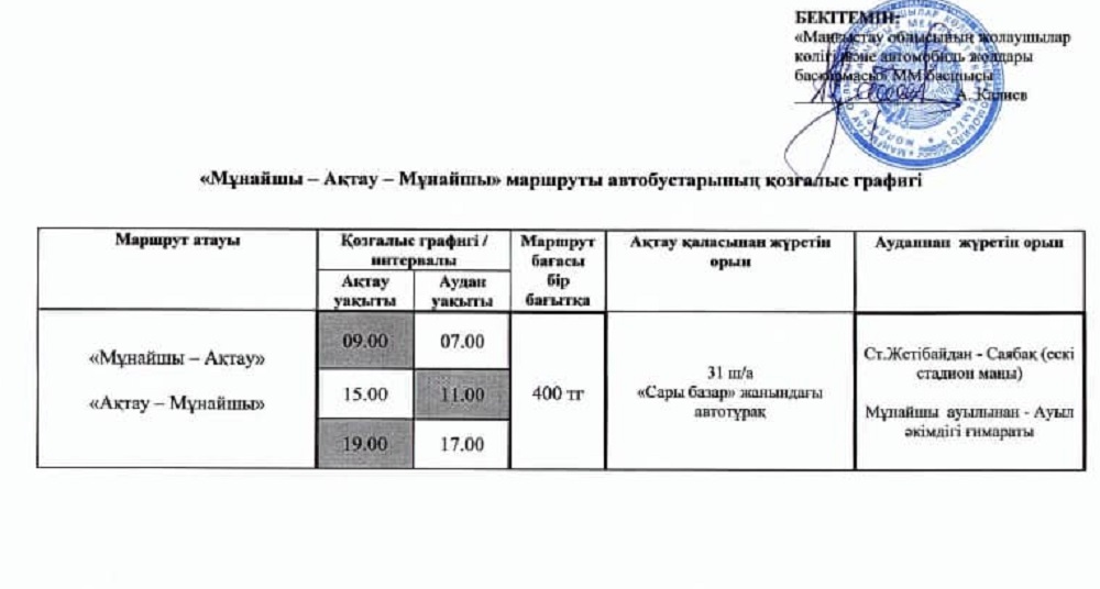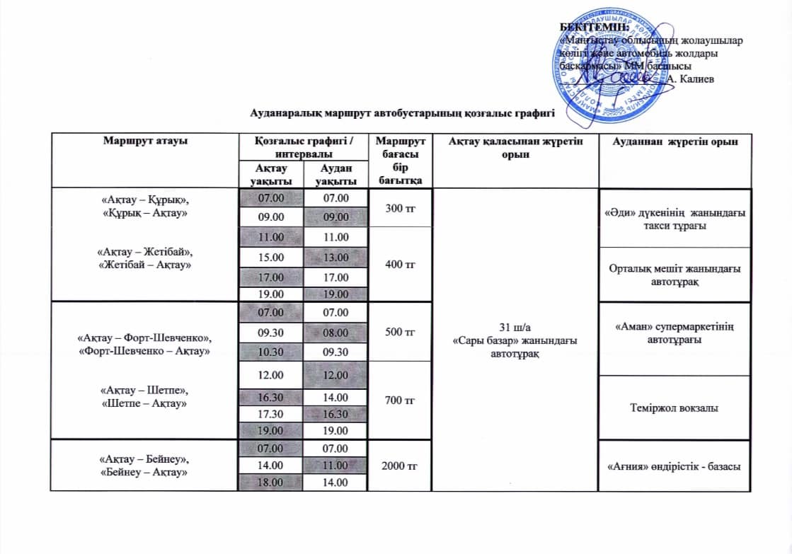 Управление пассажирского транспорта и автомобильных дорог опубликовало новый график движения автобусов до Курыка, Шетпе, Бейнеу, Жетыбая и Форт-Шевченко.