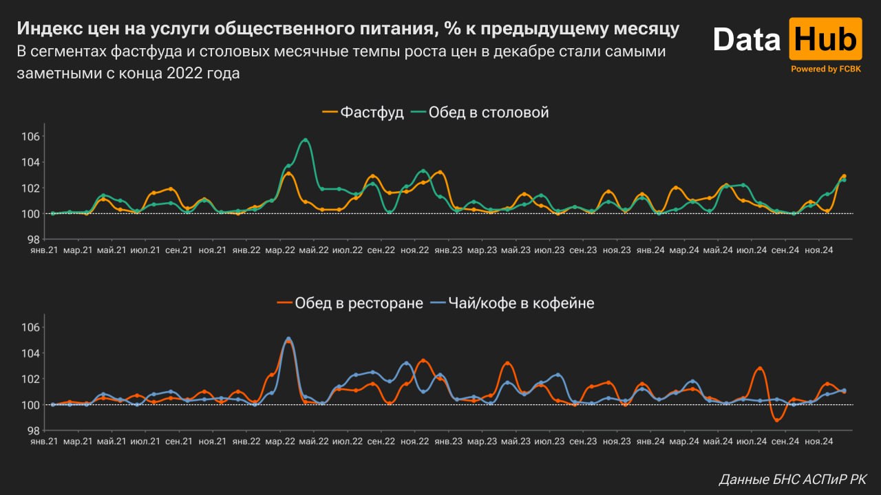 За декабрь заметно повысилась стоимость и обеда в столовой (+2,6%, рекорд с ноября 2022-го). Сильнее всего выросли цены опять же в Алматы, +7,8%. В годовом выражении по РК набежало 12%, в Алматы – 24,9%.