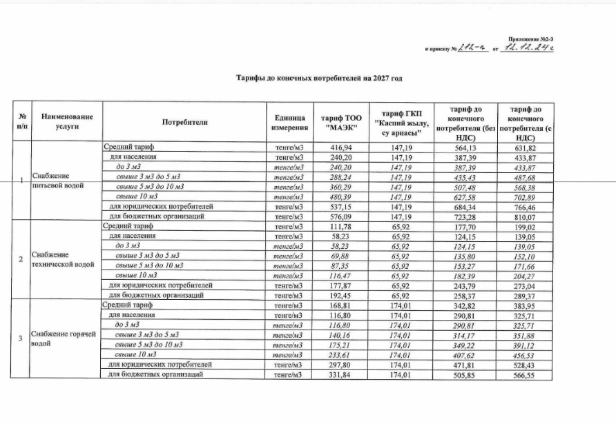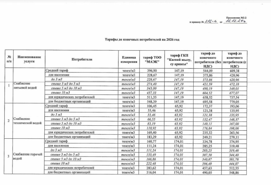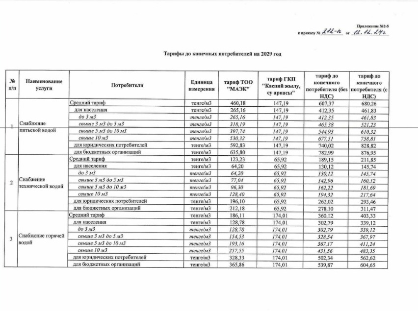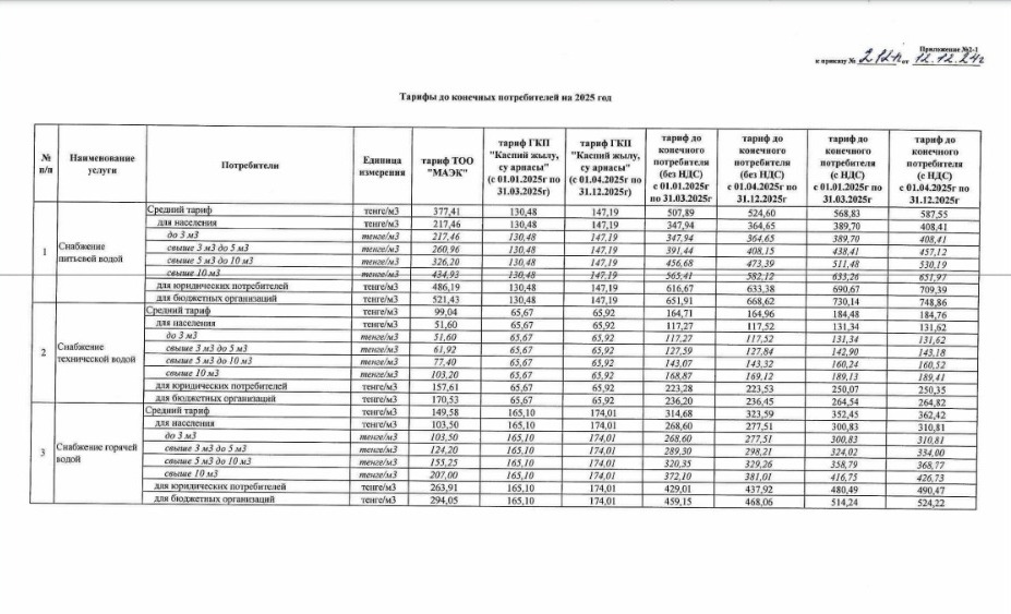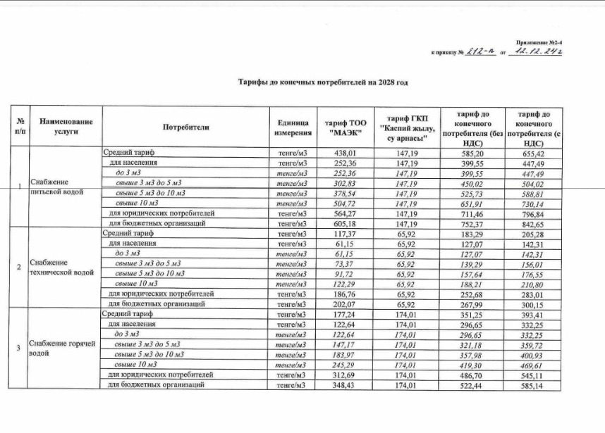 Департамент Комитета по регулированию естественных монополий РК по Мангистауской области утвердил ТОО «МАЭК» новые тарифы 2025-2029 годы на снабжение питьевой, технической, горячей водой.