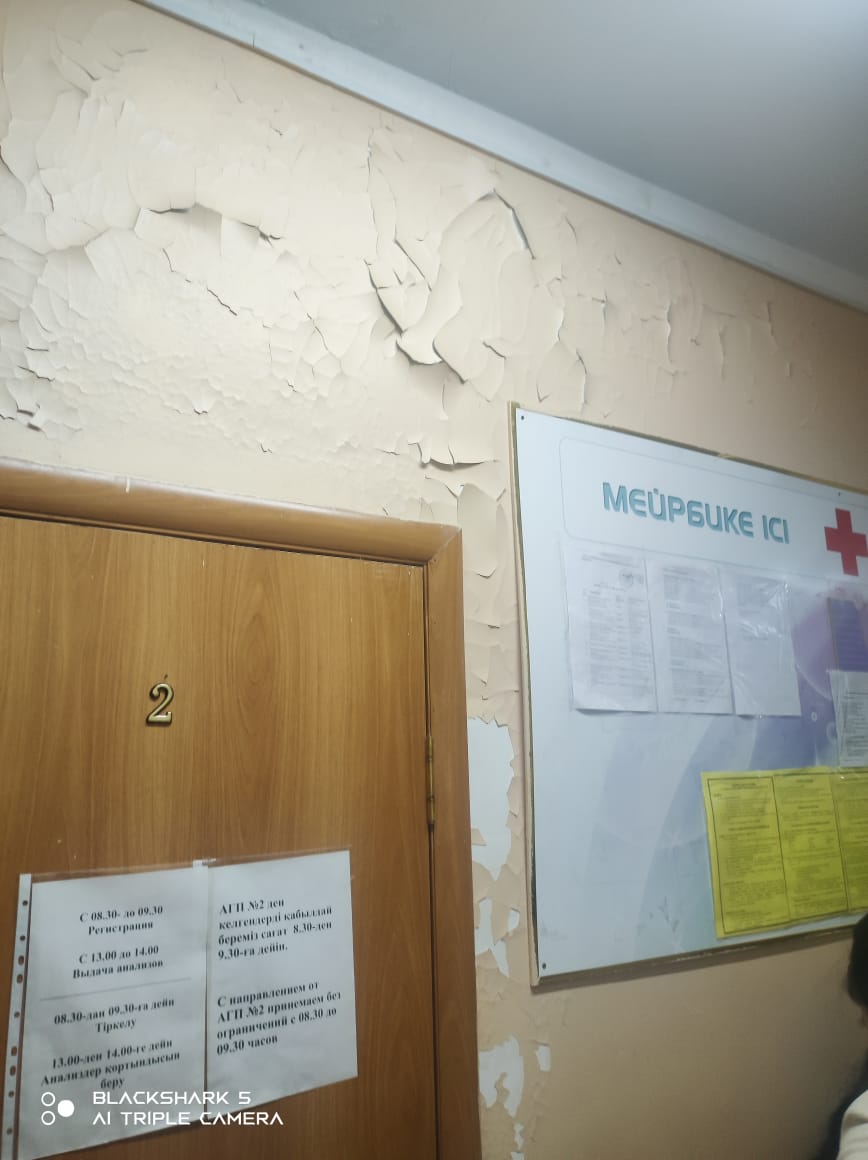 При посещении кожвендиспансера пациенты увидели на стенах у врачебных кабинетов осыпающуюся краску со шпатлевкой, чем были ошарашены. Сделав снимки, обеспокоенные люди обратились в редакцию Lada.kz.