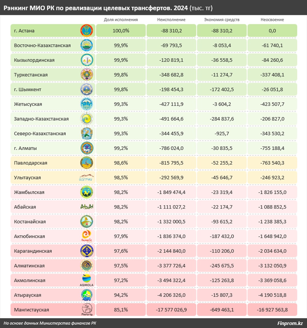 Наибольшее и критическое неисполнение целевых трансфертов среди регионов пришлось на Мангистаускую область. Неосвоение составило сразу 16,9 млрд тенге, сообщают аналитики Finprom.kz.