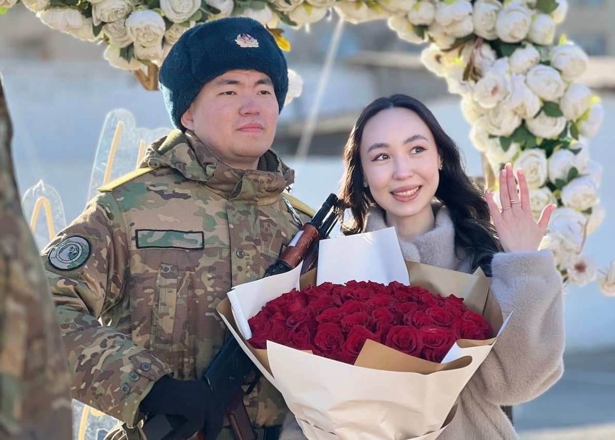 Однако церемония закончилась неожиданным поворотом событий. Во время принятия присяги рядовой Артур Сарсенгалиев сделал предложение своей возлюбленной Гульназ.