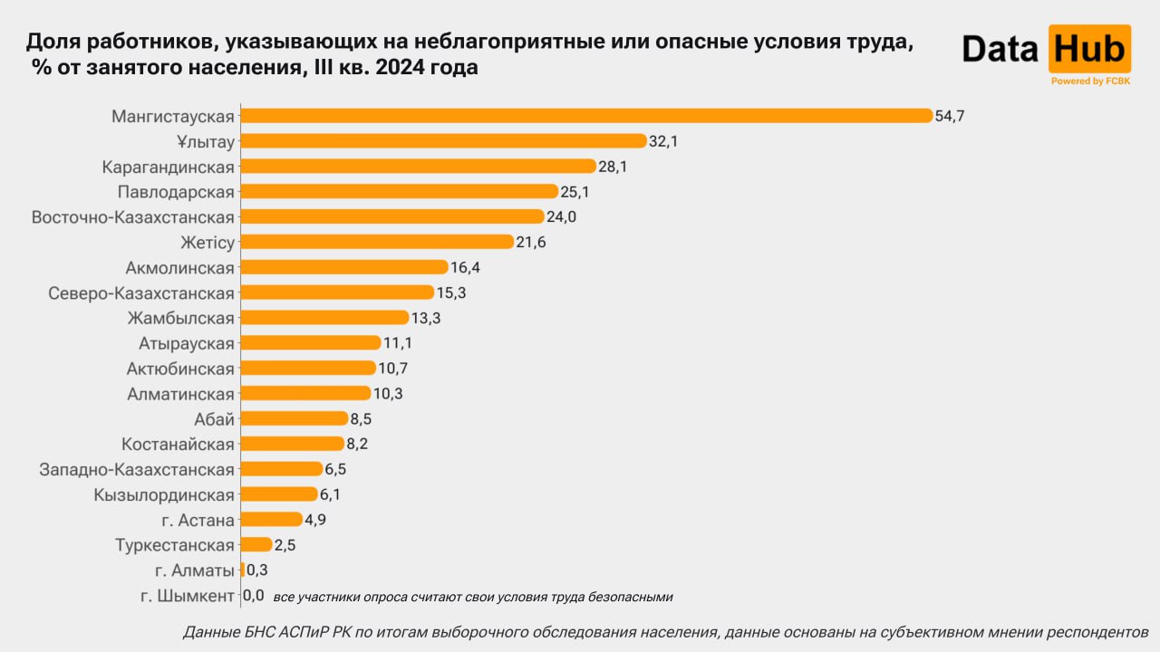 Каждый десятый казахстанец указывает на проблемы с безопасностью своего труда. В Мангистауской области доля работников, указывающих на неблагоприятные или опасные условия труда, составила 54,7% от занятого населения. Такие данные приведены в ежегодном исследовании Бюро национальной статикики РК за III квартал прошлого года, передает DataHub.