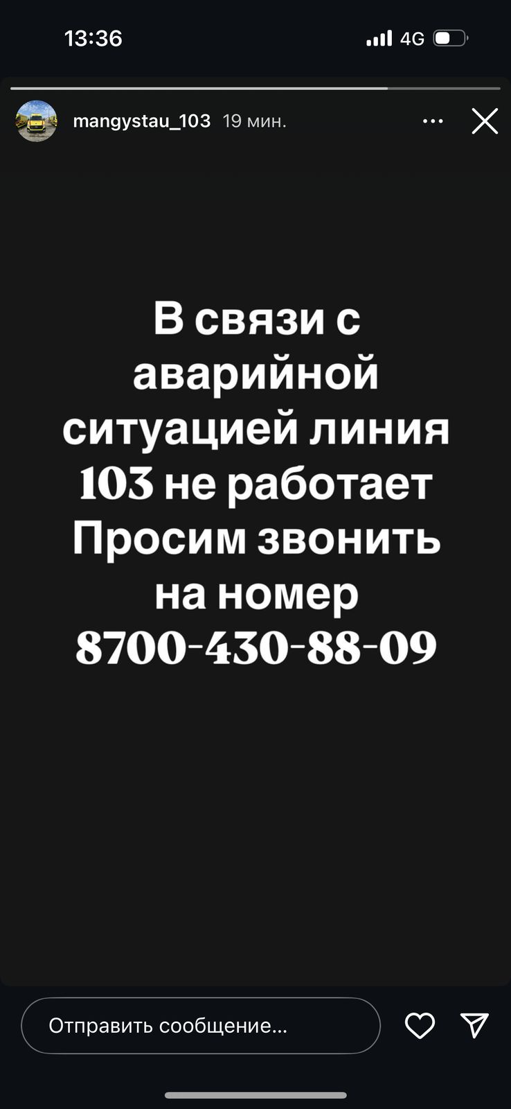 Из-за аварийной ситуации линия «103» не работает. Об этом сообщается на официальной странице Мангистауской областной Станции скорой помощи в Instagram.