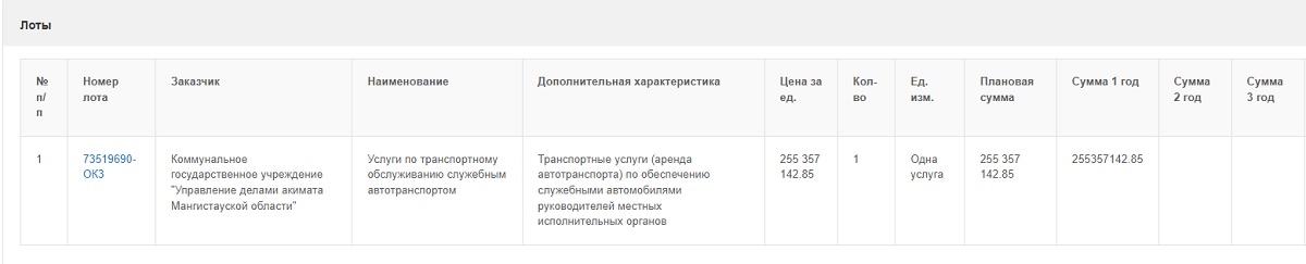 Наименование – услуги по транспортному обслуживанию служебным автотранспортом. Плановая сумма – 255 357 142.85 тенге за год.