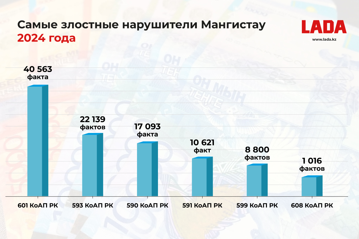 В департаменте полиции Мангистауской области назвали самых злостных нарушителей 2024 года и предоставили Lada.kz список статей, по которым их штрафовали.