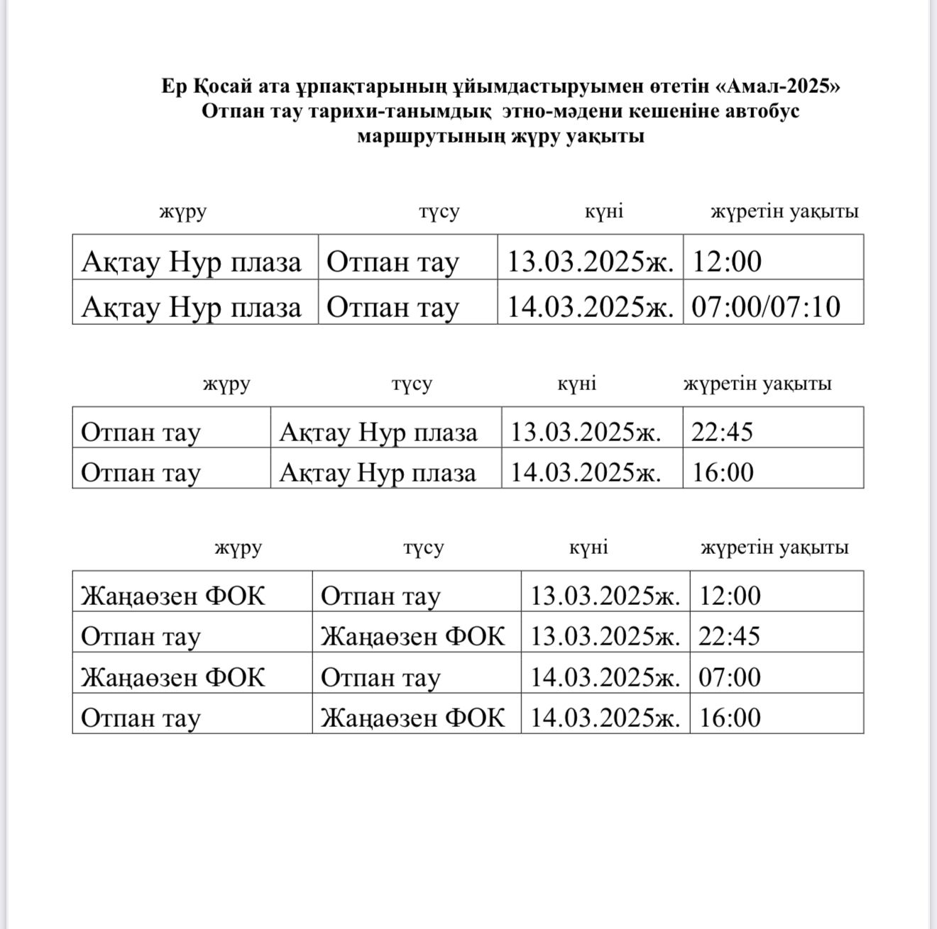 Утверждено расписание движения автобусов, которые будут курсировать из Актау и Жанаозена к историко-культурному комплексу Отпан-тау в рамках праздника Амал-2025, организуемого потомками Ер Косая, передает Lada.kz.