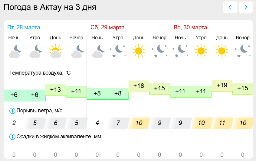 Согласно прогнозу Gismeteo, в Актау до конца недели дневная температура воздуха поднимется до +18…+19 °C.
