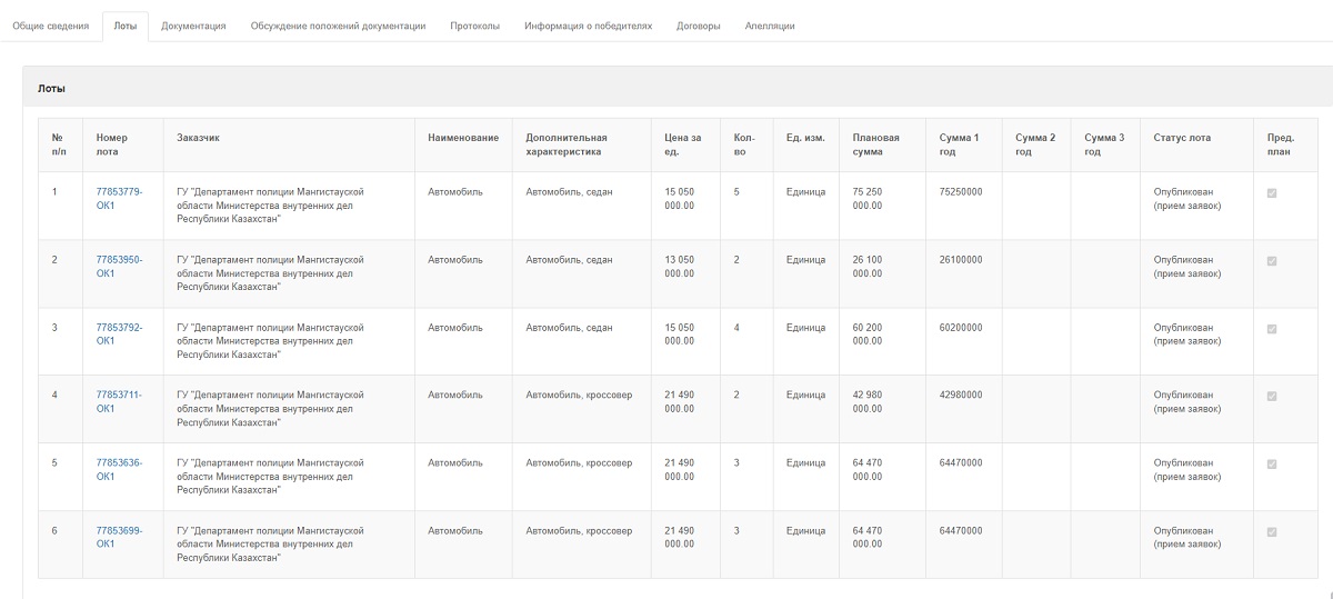В одной заявке указаны шесть лотов. Полиция Мангистау планирует закупить: