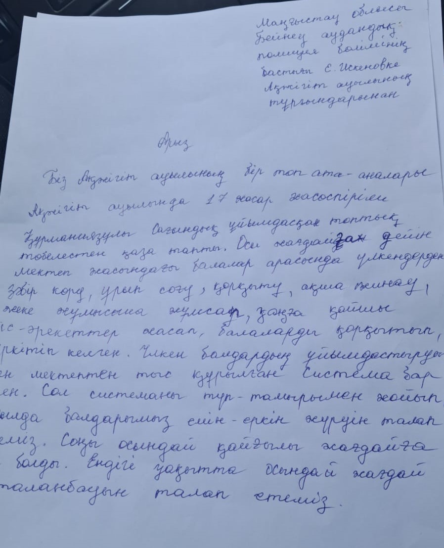 Семьи села Акжигит написали открытое письмо начальнику отдела полиции Бейнеуского района Еркебулану Изкенову. В нем они указали, что группировкой молодых людей выстроена система поборов и запугивания школьников. Жители боятся, что если не искоренить эту порочную практику и не наказать всех виновных, то трагедия с гибелью 17-летнего подростка может повториться, передает Lada.kz.