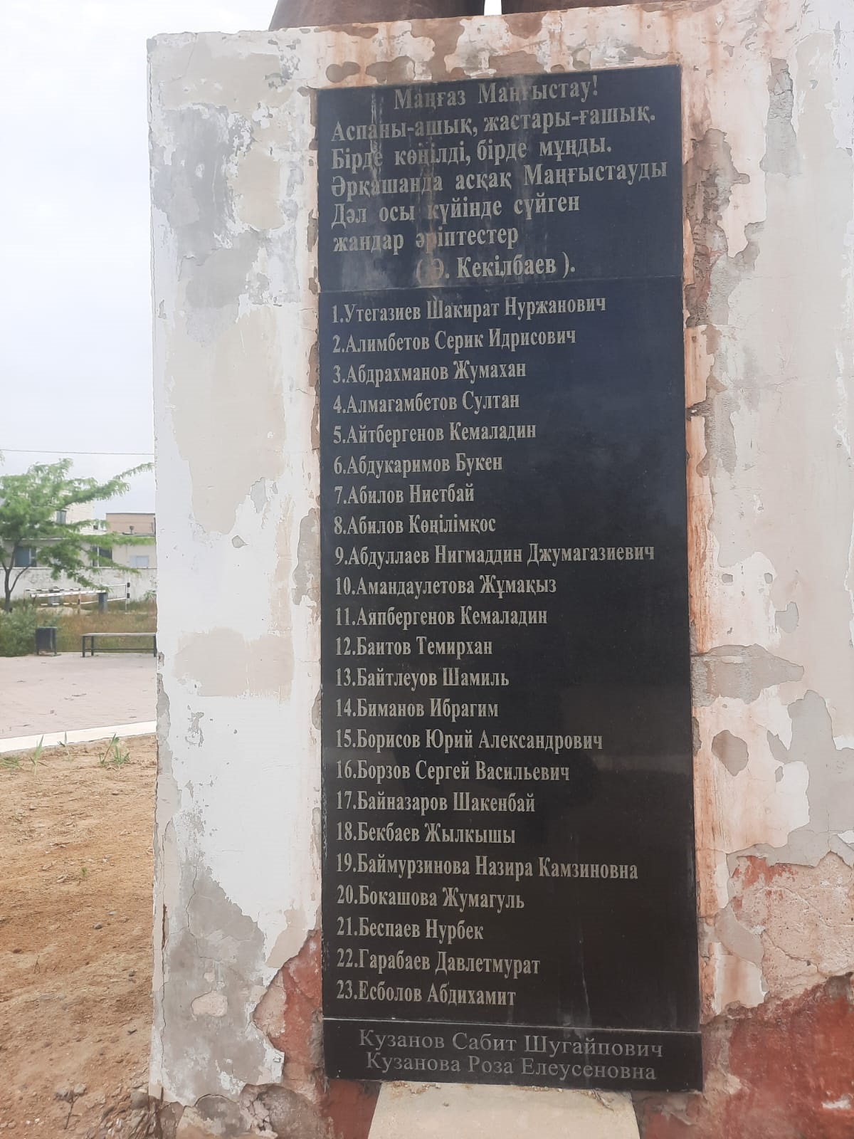 Местный житель Орал Кадиримбетов рассказал, что обелиск был установлен в 2017 году под его руководством при участии скульпторов из Узбекистана. По его словам, он неоднократно обращался в Мангистаускую областную больницу с просьбой о реставрации памятника, однако ему ответили, что в бюджете учреждения средства на ремонт не предусмотрены.