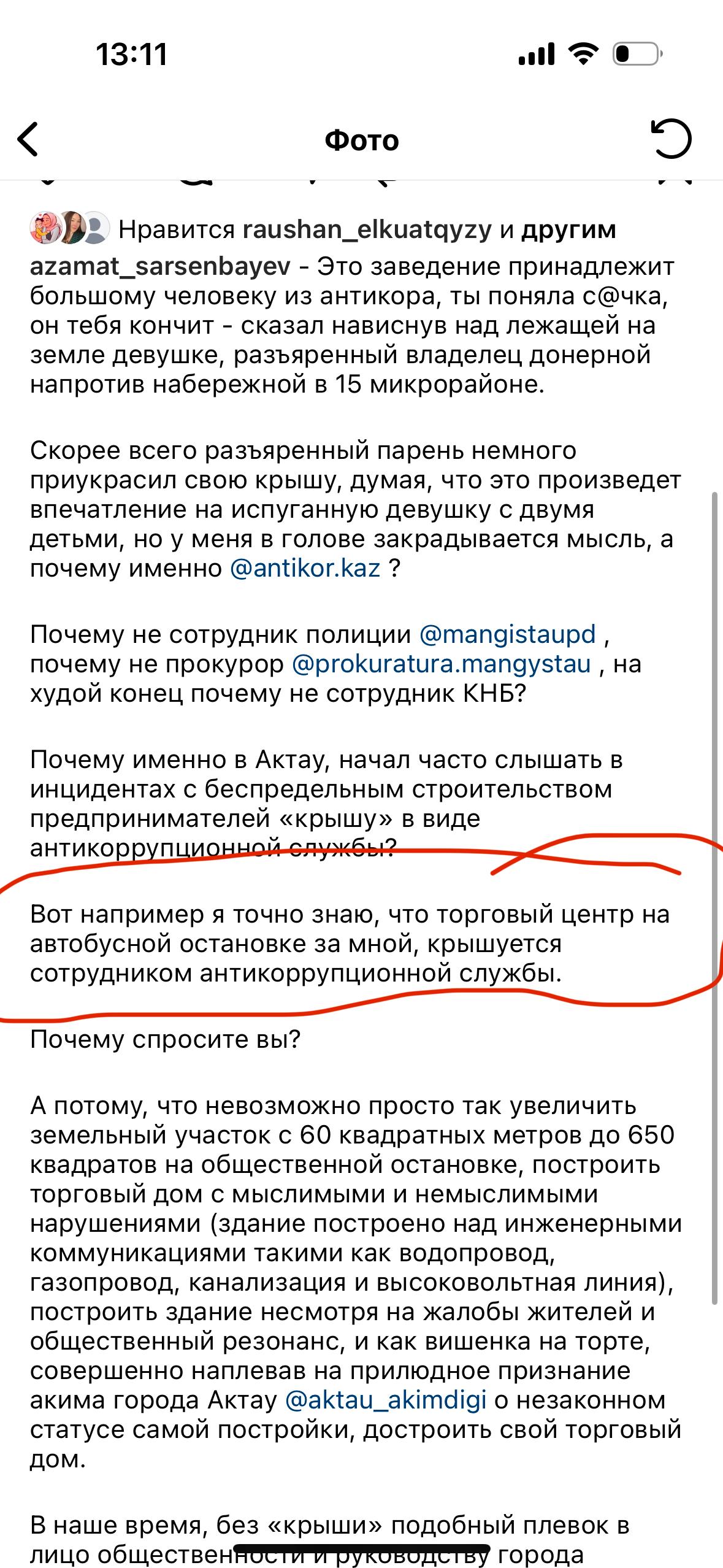 «Хотелось бы высказаться по поводу привлечения Азамата Сарсенбаева к административной ответственности по ст.73-3 КоАП за клевету в отношении антикоррупционной службы. Указанный гражданин, который позиционирует себя как блогер и представитель масс-медиа, в своем посте уверенно заявил о «крышевании» одного из объектов общественного питания со стороны антикоррупционной службы. При этом никаких доводов им не было приведено ни в самой публикации, ни в ходе рассмотрения дела в суде. В соответствии со статьей 17 Закона «Об онлайн-платформах и онлайн-рекламе РК», блогеры, как и другие граждане, обязаны проверять достоверность размещаемого контента. Соответственно, публичная деятельность указанного лица, обязывает его не распространять информацию, не соответствующую действительности, а также соблюдать права и законные интересы других лиц.
