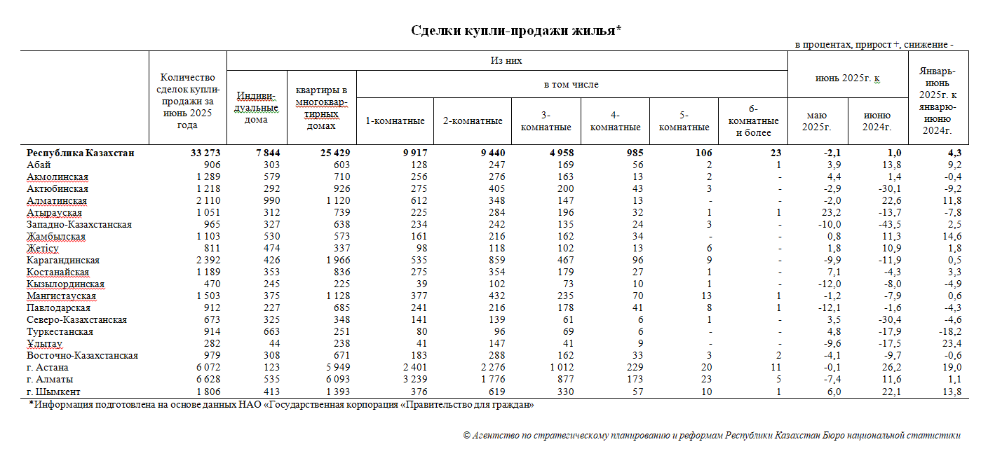 В целом по Казахстану за июнь зарегистрировано 33 273 сделки, что на 2,1% меньше, чем в мае. Лидерами по количеству операций стали Алматы (6 628 сделок), Астана (6 072) и Карагандинская область (2 392). Меньше всего сделок зафиксировано в области Улытау – 282.