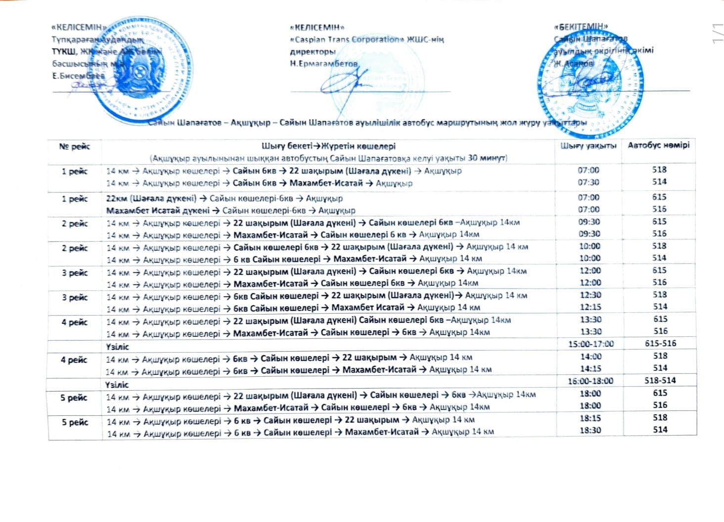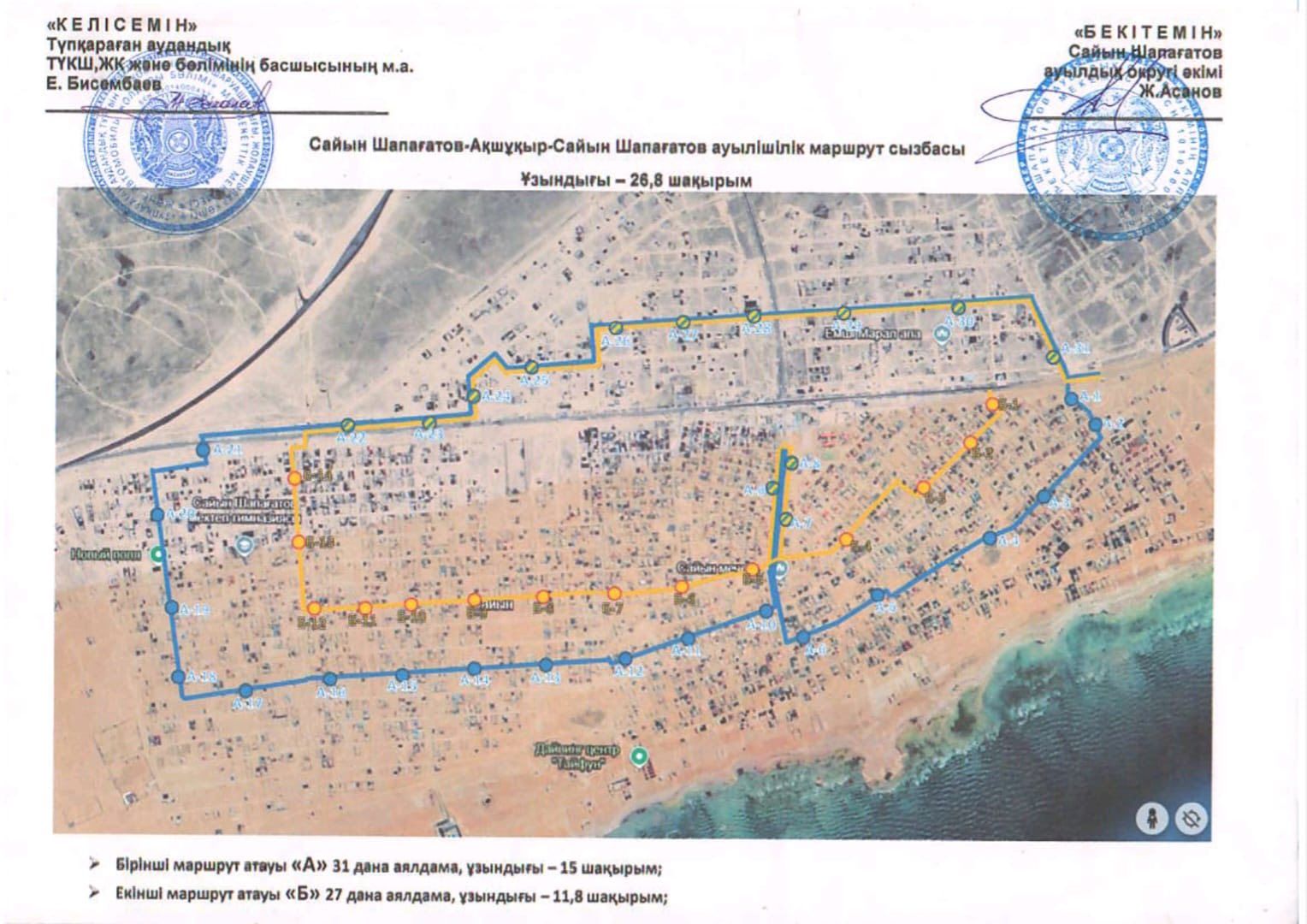 - второй рейс также заезжает в 6-й квартал с остановки А-31, объезжает село и выходит с остановки Б-1 у магазина «Махамбет-Исатай».