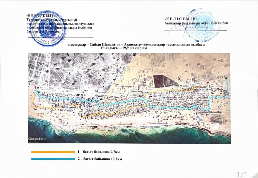 - второй рейс, в 07:30 (по жёлтой стрелке на схеме), также отправляется от 14-го км Акшукур, двигается по улицам села, заезжает в 6-й квартал Сайын Шапагатов и выходит у магазина «Махамбет-Исатай».