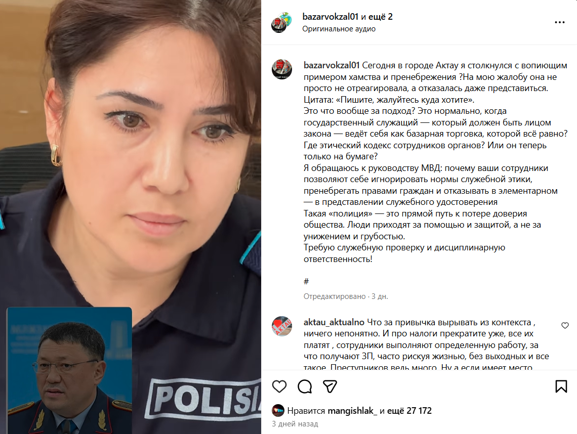 Сегодня в Актау я столкнулась с вопиющим примером хамства и пренебрежения? На мою жалобу она не просто не отреагировала, а отказалась даже представиться. Цитата: «Пишите, жалуйтесь куда хотите». Это что вообще за подход? Это нормально, когда государственный служащий, который должен быть лицом закона, ведёт себя как базарная торговка, которой всё равно? Где этический кодекс сотрудников органов? Или он теперь только на бумаге?, - написала автор в социальной сети.