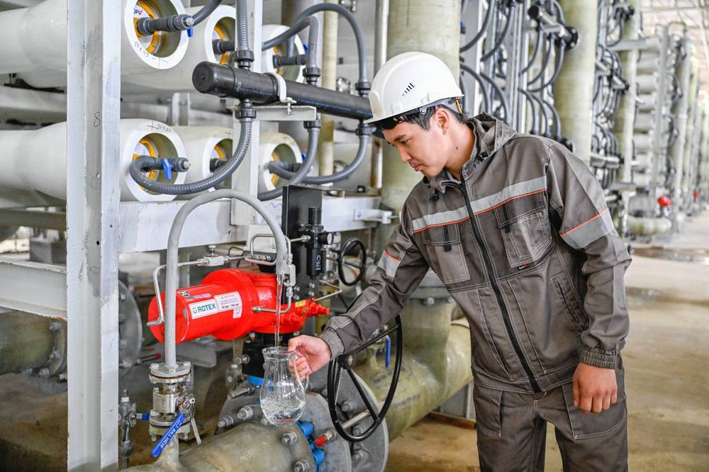 Опресненную морскую воду на новом заводе попробовали аким региона Нурдаулет Килыбай и глава КМГ Асхат Хасенов.