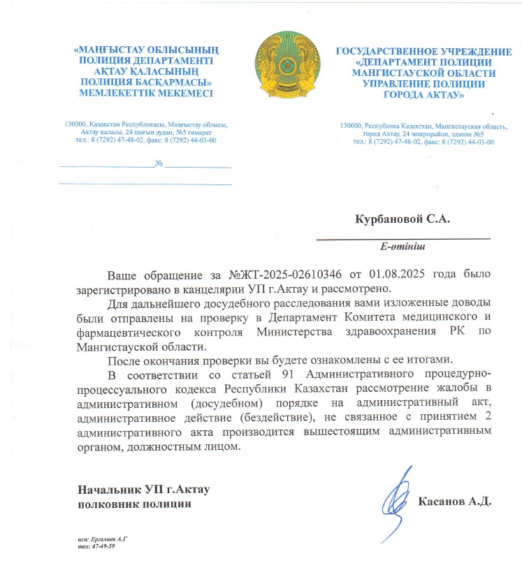 «Согласно статье 179 УПК РК, при наличии поводов и оснований, предусмотренных статьёй 177 УПК РК, полиция должна возбудить уголовное дело, а не перенаправлять материалы в иные органы. Из ответа управления здравоохранения Мангистауской области следует, что причастные медицинские работники привлечены к дисциплинарной ответственности. Это прямо свидетельствует о наличии признаков нарушения стандартов медицинской помощи. Отказ в регистрации материала в ЕРДР препятствует проведению судебно-медицинских экспертиз и иных следственных действий, необходимых для установления объективной картины по делу», - рассказала юрист.