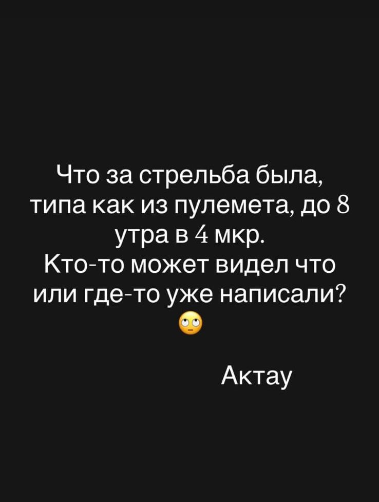О предполагаемой стрельбе жители областного центра начали сообщать сегодня, 23 сентября. По их сообщениям, звуки, похожие на пулеметную очередь, слышали несколько раз в промежутке между 06:00 и 08:00 часами в районе 3, 4 и 5 микрорайонов. Некоторые жители говорят, что слышали их и в верхней части города, в частности, в 26 микрорайоне.