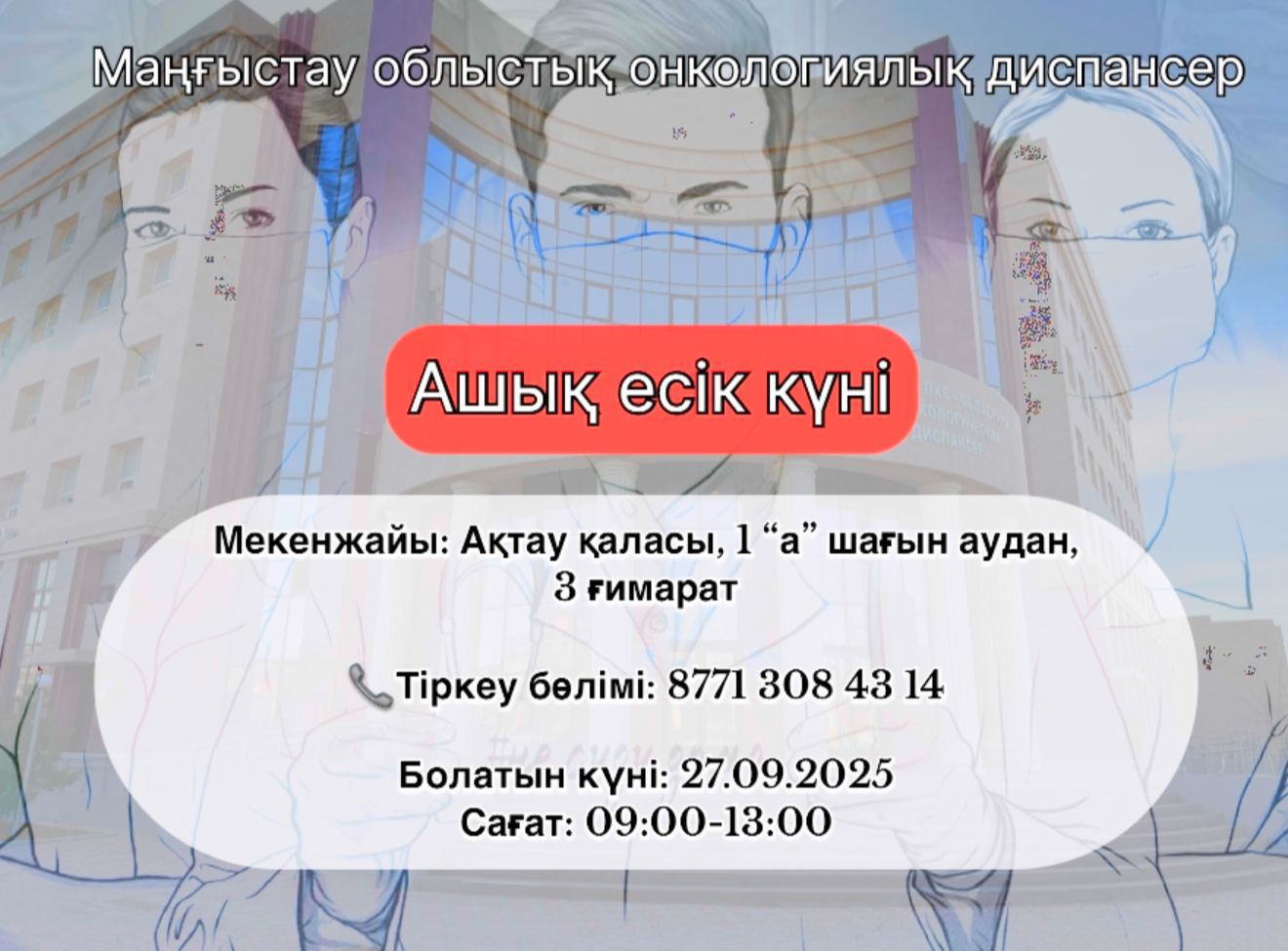 В субботу, 27 сентября, в Мангистауском областном онкологическом диспансере и в Бейнеуской районной поликлинике пройдет День открытых дверей. Цель мероприятия – выявление всех видов раковых заболеваний на ранней стадии, сообщает Lada.kz.