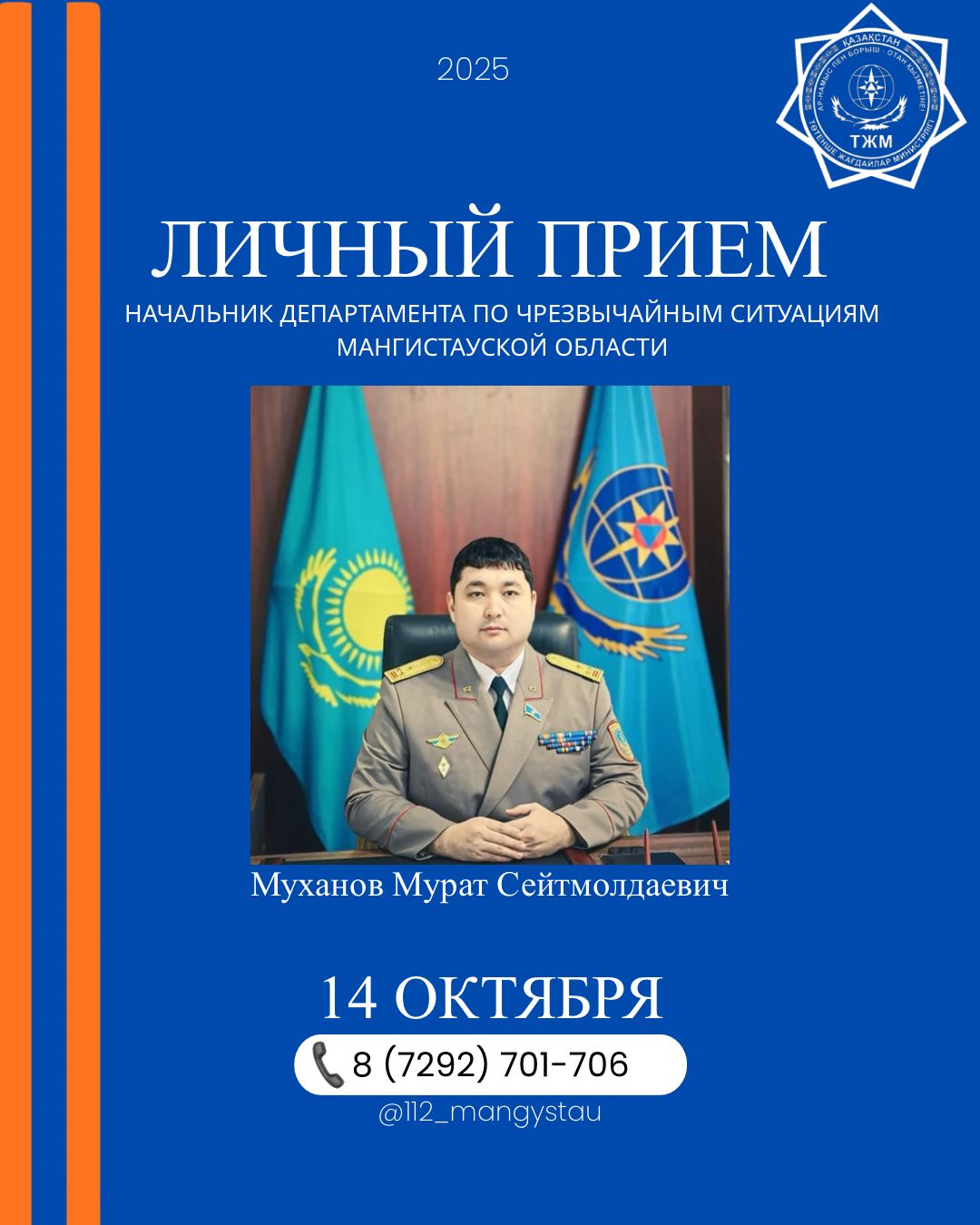 Начальник департамента по чрезвычайным ситуациям Мангистауской области Мурат Муханов и главы городских, районных подведомственных отделов проведут личный прием граждан, передает Lada.kz.