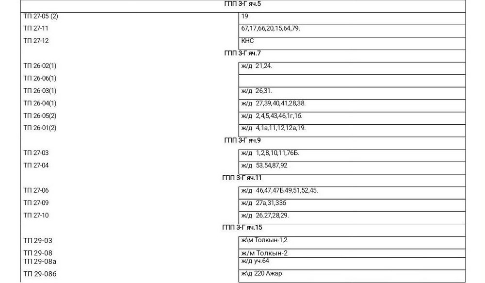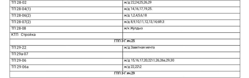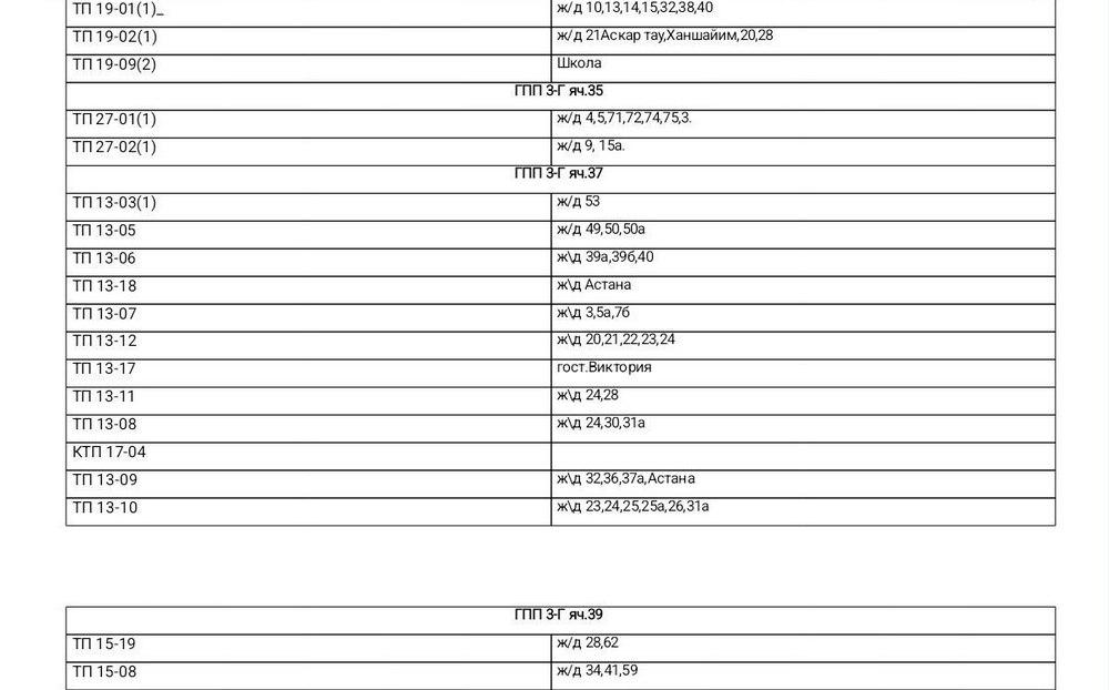 В ГКП «АУЭС» уточнили, что отключения будут частичными - энергетики предоставили список домов и объектов, попадающих под плановые работы. В перечне указаны обозначения подстанций, например ТП15-10, что соответствует 15 микрорайону. Рядом с подстанцией перечислены дома, где временно не будет электричества.