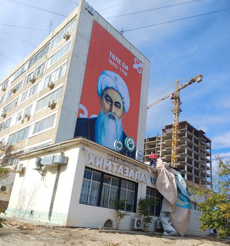 Ранее на этом месте висел портрет Айтеке би, который сняли из-за ветхости полотна. Горожанам обещали обновить тот же образ, однако на фасаде разместили изображение другого исторического оратора.