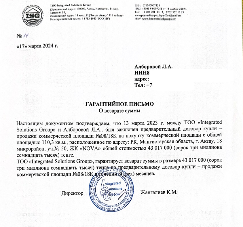 Однако дом в 2023 году дом не сдали, не сдан он и до сих пор. Соответственно, из-за отсутствия помещения об открытии бизнеса пришлось забыть. Покупательница решила вернуть свои деньги. В марте 2024 года директор компании Кайрбулат Жангалиев написал гарантийное письмо о возврате суммы в течение трех месяцев, но деньги так и не поступили.
