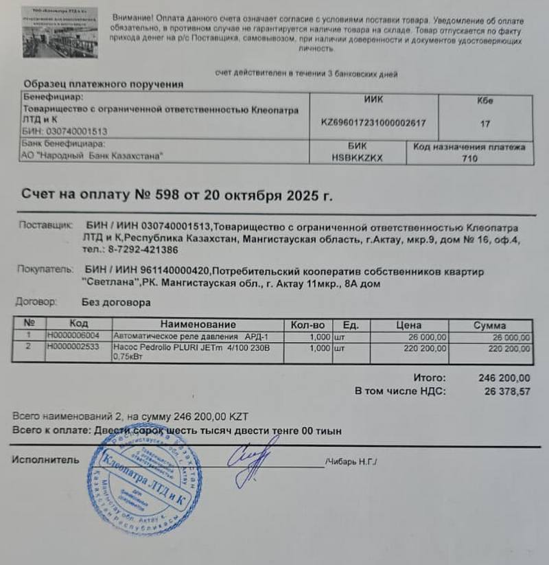 Покупка была произведена ПКСК «Светлана» на сумму 246 тысяч тенге, без учета расходных материалов.