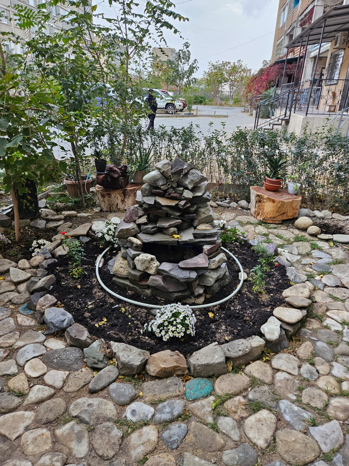 Во дворе одного из домов Актау появился настоящий уголок уюта. Житель дома №27 в 5 микрорайоне Владимир Леневский собственными силами благоустроил территорию перед своей квартирой и даже соорудил фонтан из подручных материалов, сообщает Lada.kz.