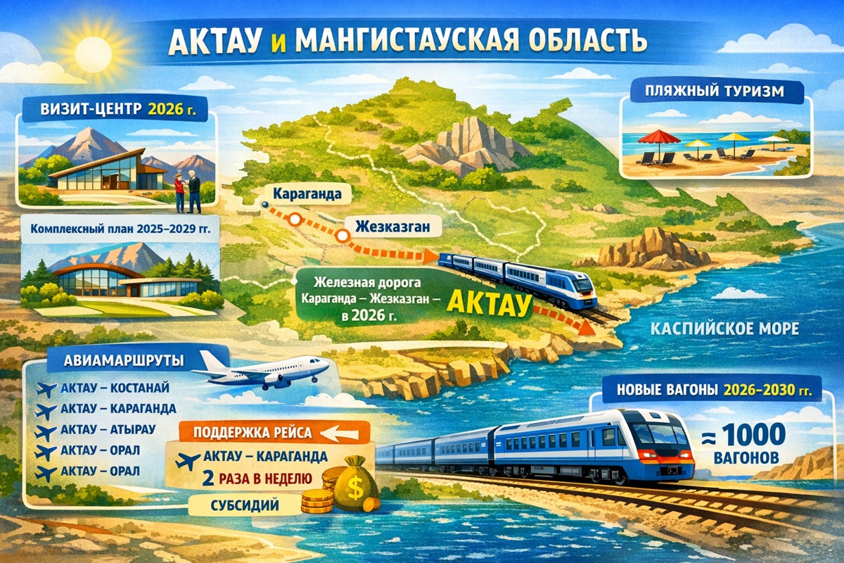 «В настоящее время организованы шесть пар поездов по туристическому маршруту «Пляжный туризм в Актау». С апреля 2026 года планируется продление пассажирского поезда по маршруту Караганда – Жезказган до Актау в рамках реализации комплексного плана развития региона».