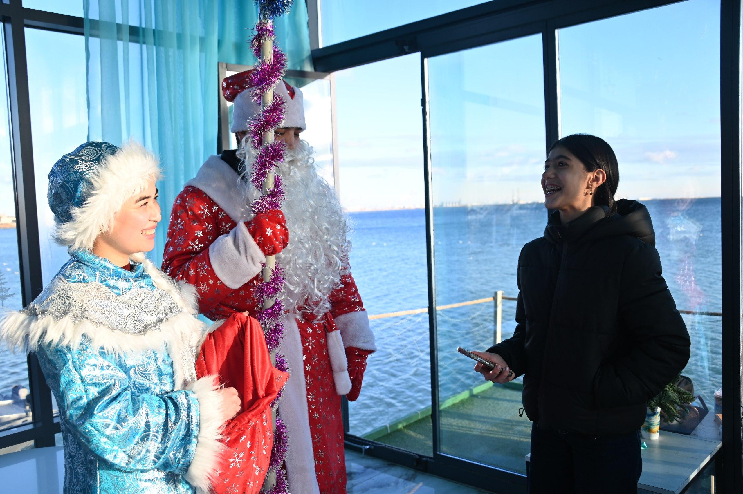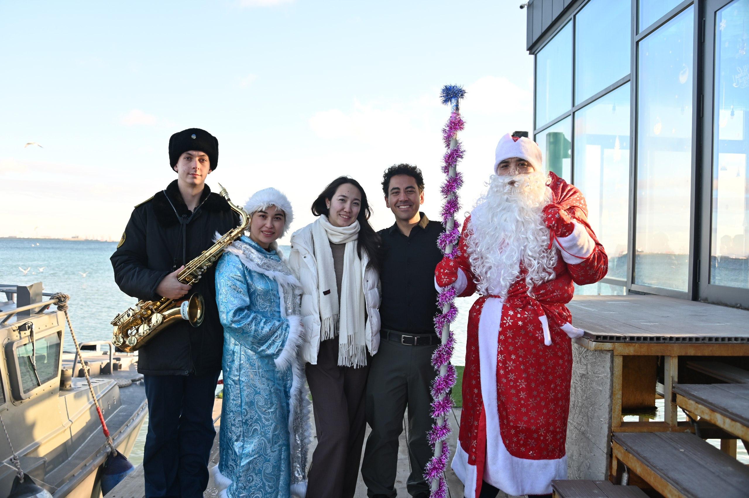 К городскому пирсу на быстроходном катере «Кайсар» прибыла группа военных моряков в компании Деда Мороза и Снегурочки. Они поздравили взрослых и детей с наступающим Новым годом, выразили им тёплые пожелания и подарили сладкие подарки.