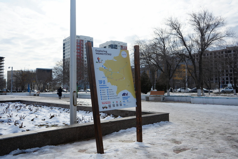 Речь идет о новом стенде с надписью «Exploring Mangystau», на котором размещены карта Мангистауской области и список 10 туристических мест региона. Также на конструкции указаны маршруты, QR-коды с дополнительной информацией и экстренные номера.