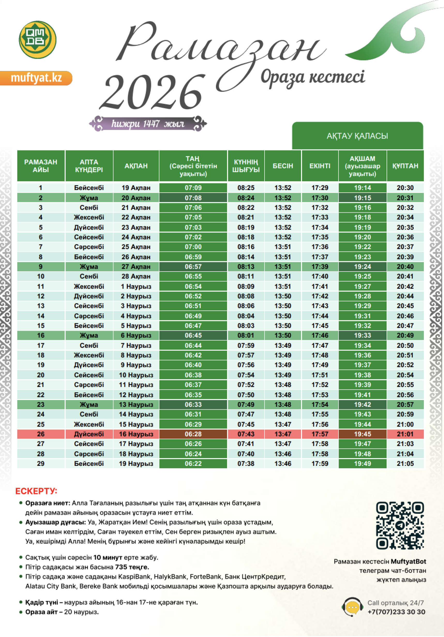 Духовное управление мусульман Казахстана опубликовало официальное расписание поста ораза на 2026 год для Актау, сообщает Lada.kz.