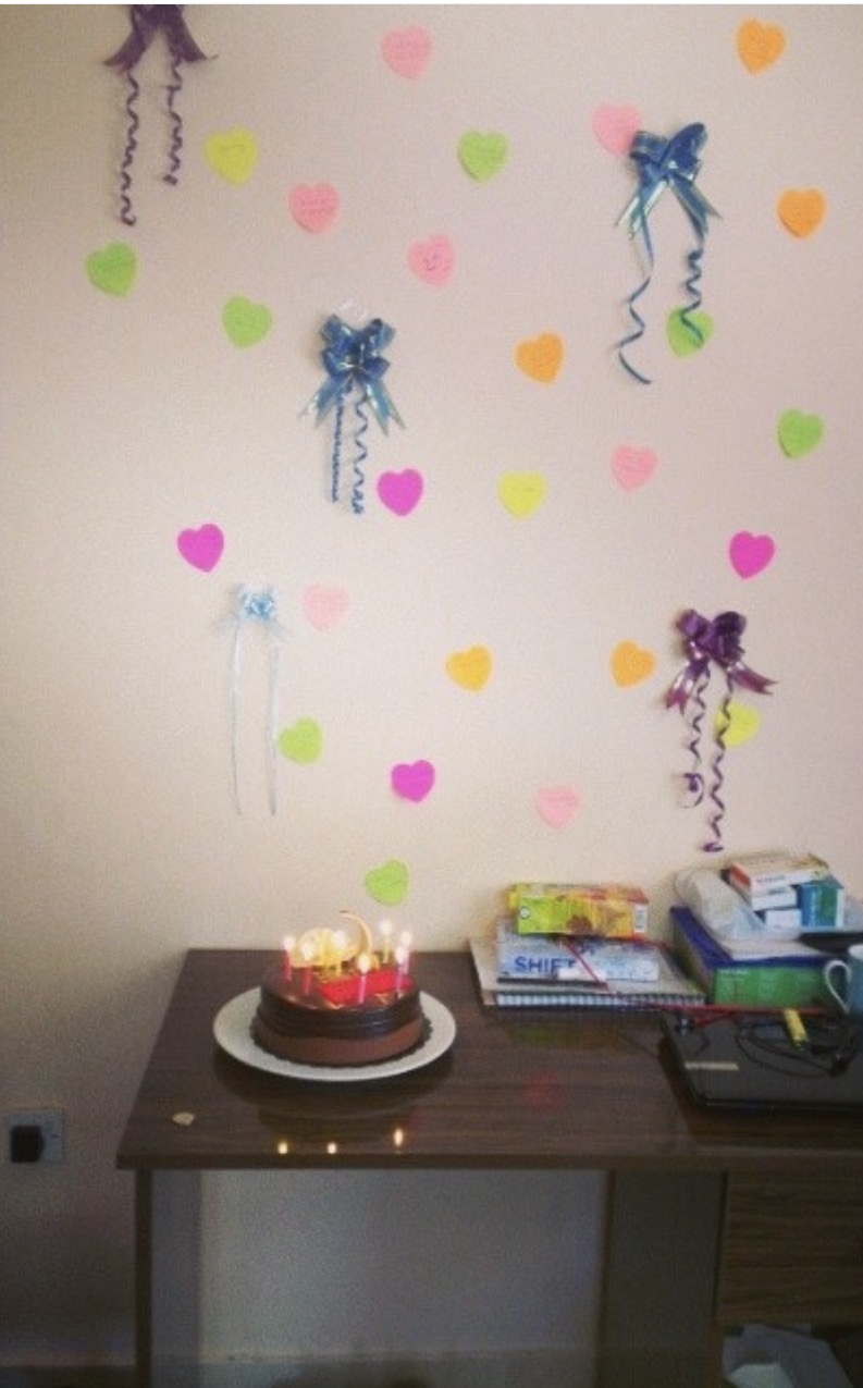 Аринзе: - Да, это был день моего рождения (на тот момент мы встречались около полугода), я проснулся и увидел сюрприз на стене, она была полностью обклеена стикерами из сердечек, на которых Мария написала пожелания, а на столе стоял торт. Было очень неожиданно, я даже не понял когда Мария успела это сделать