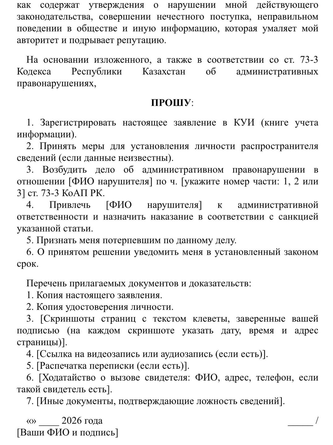 К обращению рекомендуется приложить доказательства: скриншоты публикаций, ссылки на страницы, видеозаписи, аудиофайлы, а также указать возможных свидетелей. В заявлении необходимо сделать ссылку на статью 73‑3 КоАП РК и адресовать документ начальнику соответствующего отдела полиции. Срок рассмотрения обращения составляет до 30 дней.
