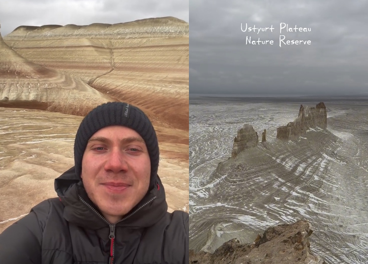 «Здесь, в Мангистауской области, есть национальный парк с пейзажами буквально не из этого мира. Мы объехали заповедник, чтобы полюбоваться красотой с разных точек обзора, и пейзажи были просто неземными. Вдалеке мне даже удалось заметить диких баранов. После быстрого обеда мы сменили локацию, чтобы увидеть другие оттенки и краски. Мне уже тогда казалось, что я стою на другой планете, но, как оказалось, летом пейзажи ещё более впечатляющие - глинистые склоны сияют ещё более яркими цветами. Но есть один плюс посещения зимой - ни одного человека вокруг. Поэтому горы были полностью в моём распоряжении, и я отправился на небольшую прогулку».